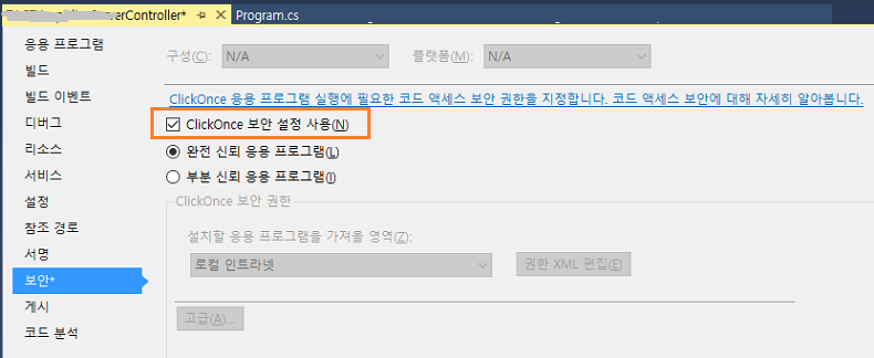 1) 프로젝트 속성 > 보안 : 'ClickOnce 보안 설정 사용'을 체크