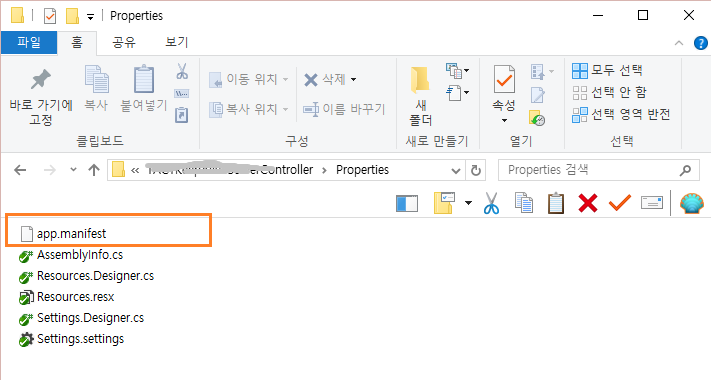2) 소스 폴더에 [Properties] 폴더와 그 안에 app.manifest 파일이 생성됩니다.
