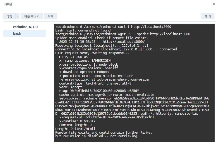 Redmine은 처음 실행 시 DB 테이블을 만드느라 시간이 꽤 걸립니다(3~5분). [로그] 탭에 Listening on http://0.0.0.0:3000 문구가 뜰 때까지 느긋하게 기다려 주세요.