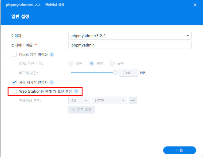 첫 화면에서 'Web Station을 통해 웹 포털 설정' 체크를 반드시 해제하세요. 이걸 해제해야 포트 충돌 없이 원하는 포트를 설정할 수 있습니다.